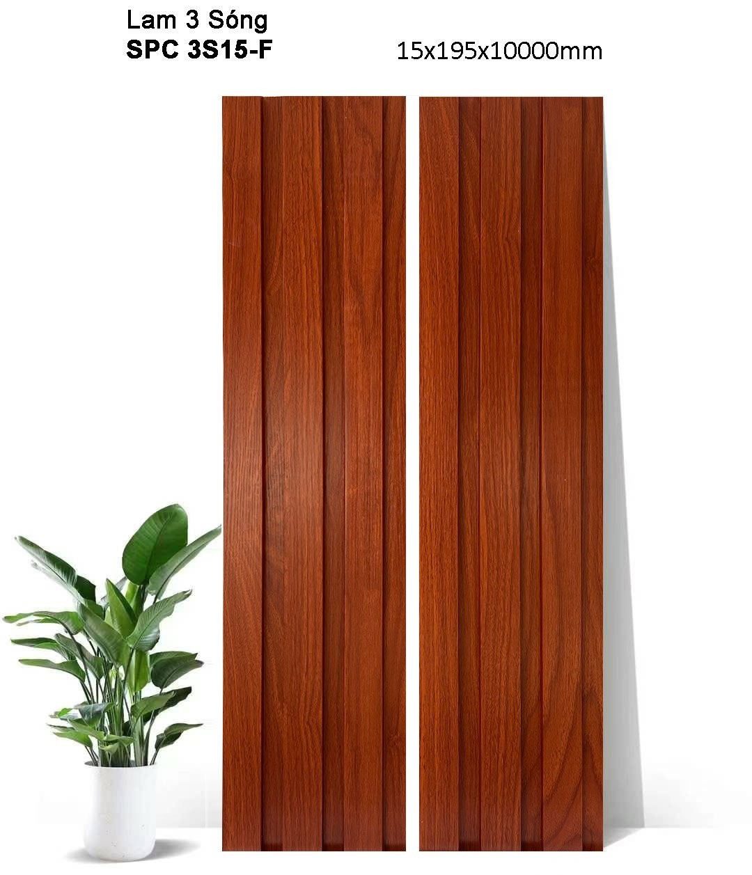 Giá theo Md: 72.000 đ/m Giá theo M2: 368.000 đ/m2 Sản xuất theo kích thước yêu cầu, thời gian từ 5~10 ngày Tồn kho: Thanh 3m – 7m Thương hiệu : iWood Kích thước (W x H x L) : 195 x 15 x 3000mm Màu sắc: 3S15-F Bề mặt : Phủ film vân gỗ Chất liệu: Nhựa SPC siêu cứng Xuất xứ: Việt Nam Ứng dụng: ốp tường, trần, vách trang trí….. Bảo hành: 3 năm