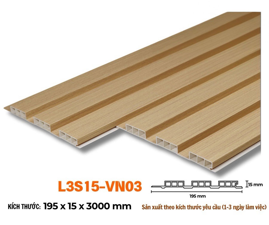 Sản xuất theo kích thước yêu cầu, thời gian từ 2~3 ngày Tồn kho: Thanh 3m Thương hiệu : VINAWALL Kích thước (W x H x L) : 195 x 15 x 3000mm Đơn vị tính 1 thanh = 0.594m2 Màu sắc: VN03 Bề mặt : Phủ film vân gỗ, hèm V Chất liệu: nhựa SPC Xuất xứ: Việt Nam Ứng dụng: ốp tường, trần, vách trang trí….. Bảo hành: 3 năm
