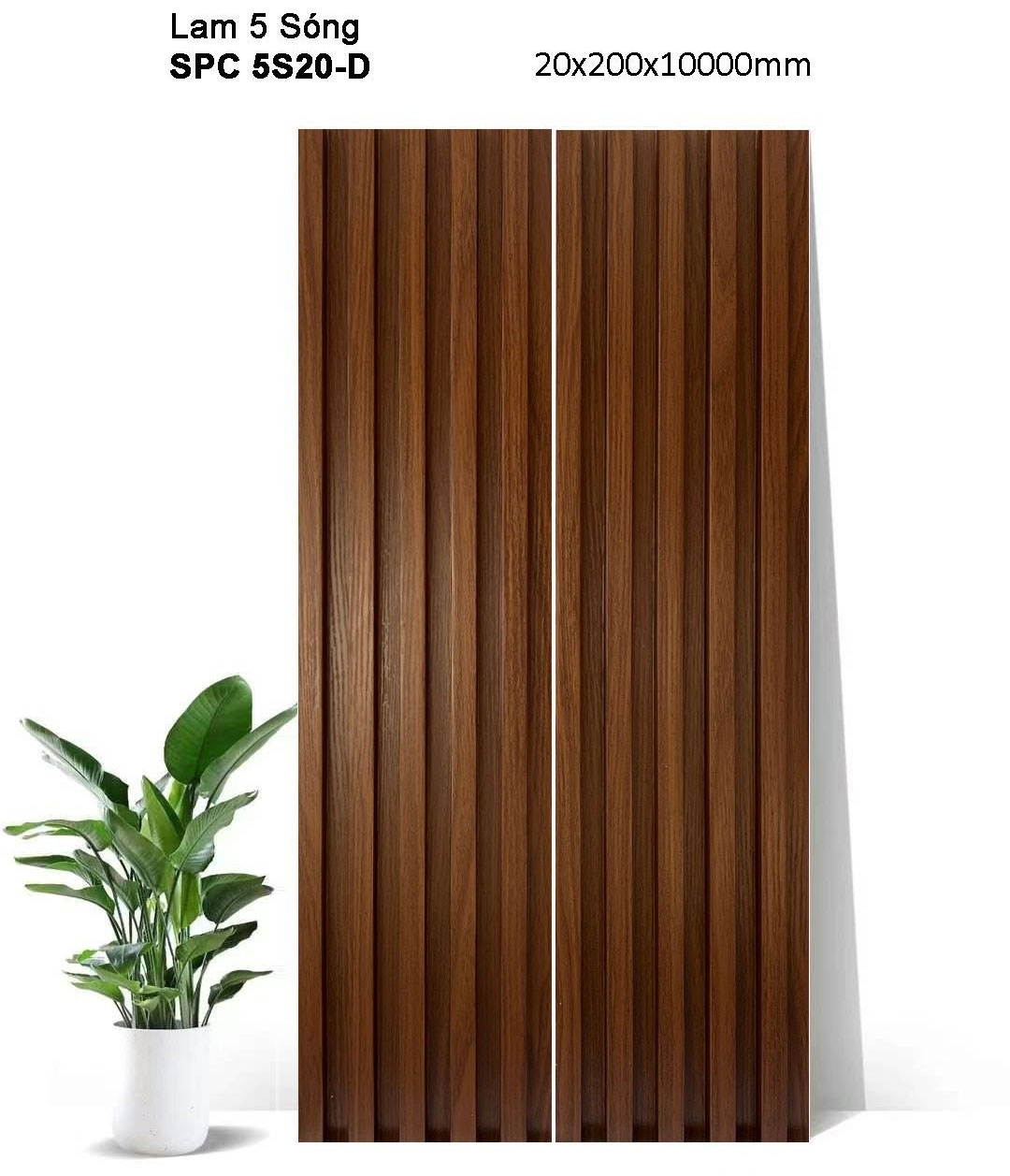 Giá theo Md: 79.000 đ/m Giá theo M2: 395.000 đ/m2 Sản xuất theo kích thước yêu cầu, thời gian từ 5~10 ngày Tồn kho: Thanh 3m – 7m Thương hiệu : iWood Kích thước (W x H x L) : 200 x 20 x 3000mm Màu sắc: 5S20-D Bề mặt : Phủ film vân gỗ Chất liệu: Nhựa SPC siêu cứng Xuất xứ: Việt Nam Ứng dụng: ốp tường, trần, vách trang trí….. Bảo hành: 3 năm